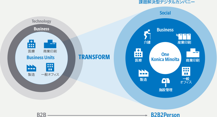 事業の競争力を高めるため、2003年の経営統合以来、当社は一貫して「ジャンルトップ戦略」を推進してきました。その基本戦略は変わりませんが、加えて今は、すべての事業をお客様の課題解決に貢献する高付加価値型ビジネスへと進化させる「業容転換」を進めています。