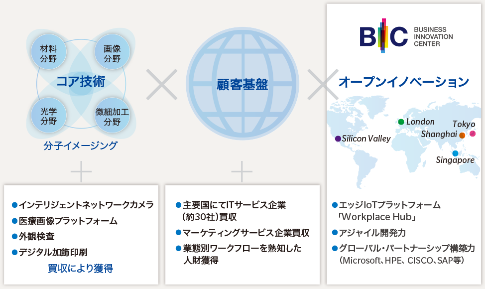 なかでも重要度の高い“仕込み”が、既存事業の高付加価値化と新たな事業の創出につながる技術や知見、ノウハウ、人財などの獲得を目的とした「戦略的M&A(企業買収)」です。情報機器やヘルスケアの分野を中心に、世界各地で多くの魅力のある企業を選別し、グループに加えてきました。