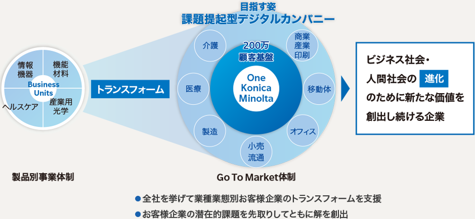 そこで「SHINKA 2019」では、この視点を180度転換し、お客様、あるいは市場からビジネスを捉え直していきます。新中期経営計画の始動に合わせて営業体制も抜本的に改革し、従来の事業・製品別の営業体制から、お客様の業種業態別の「Go To Market(GTM)体制」へと移行させていきます。今後は世界200万企業の顧客基盤を「業種・業態」ごとに捉えて、培った製品・サービスの知見・ノウハウを融合し事業や製品の枠を超えて、それぞれに応じた最適な課題提起を行っていく方針です。そして全社を挙げて各業種・業態に最適なワークフローの変革を提案していくことで、お客様のトランスフォームを支援していきます。