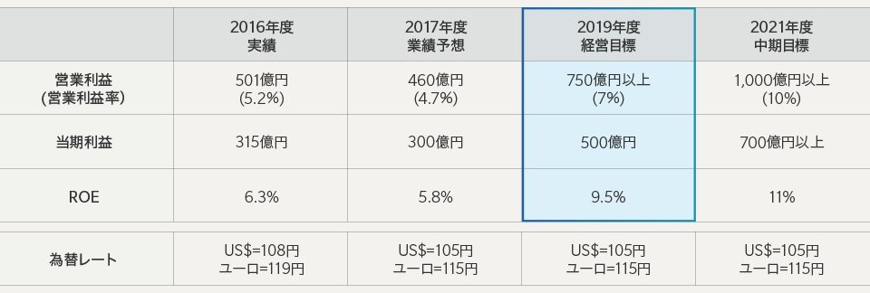 これら「基盤」「成長」「新規」の事業は、別々のものではなく、“三位一体”で進めていくべきものであると考えています。これまで基盤事業で培ってきた顧客との関係性を強化し、そこで得たさまざまな経験や蓄積を、成長事業でのビジネス拡大や、新規事業のビジネスモデル創出に活かすことで、グループ全体を高収益体質の「課題提起型デジタルカンパニー」へと変革していきます。そして、新中期経営計画の最終年度となる3年後の2019年度には、「営業利益750億円以高収益企業への変革に向けて体制を強化上、当期利益500億円、ROE9.5%」を目指します。