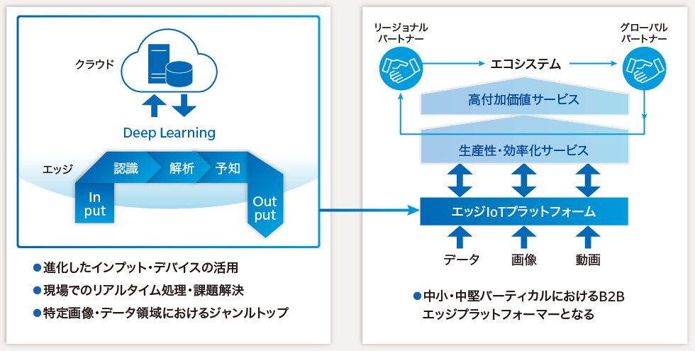 ビッグデータ解析やディープラーニングなどのサービスを、クラウドサービスとして提供するIT企業は世界に数多くありますが、私はこれらの企業と戦うつもりはありません。コニカミノルタのプラットフォームビジネスは、クラウドサービスも活用しますが、業務の現場に設置したプラットフォームにデータを集積し、解析することで、お客様企業の経営課題や業務課題を現場(=エッジ)で、リアルタイムに解決します。この「エッジIoTプラットフォーム(=エッジで解析・解決するプラットフォーム)」こそが、当社の提供する顧客価値であり、これを他社との差異化のポイントとし、ここから高い収益性を生み出していきます。