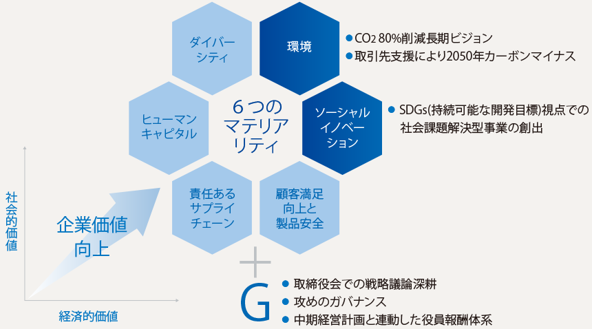 中長期の企業価値の向上には、あらゆる企業の能力を高めていく必要があると私は考えており、ESGを中心とした非財務側面についても、能力の向上に積極的に取り組んでいく方針です。それもESG側面でのリスクを抑制するといった消極的な捉え方ではなく、“世界のトップランナー”を目指した積極的な取り組みを進めたいと考えています。そのために昨年定めたのが「6つのマテリアリティ(重要課題)」です。この6つはどれも重視していますが、なかでも今後の事業展開のなかで特に重要になると考えているのが「環境」と「ソーシャルイノベーション」です。