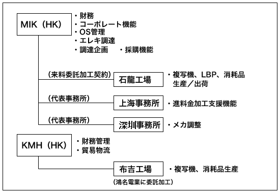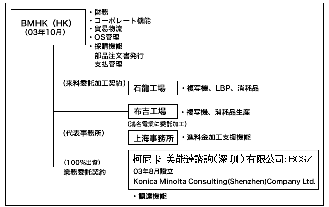旧コニカ、旧ミノルタ両社の中国生産会社は10月1日を持ってBMHKに統合いたしました。従来、旧ミノルタ側は香港に本社を置き、財務、人事、アウトソース管理、調達機能としてエレキ調達、調達企画、そして購買機能を持っていました。また来料委託加工で東莞市石龍鎮にてMFP*とレーザプリンタの生産を行っていました。上海代表事務所でMFPのオプション生産の委託先支援業務を行い、深セン代表事務所ではメカ部品調達の業務を行っていました。