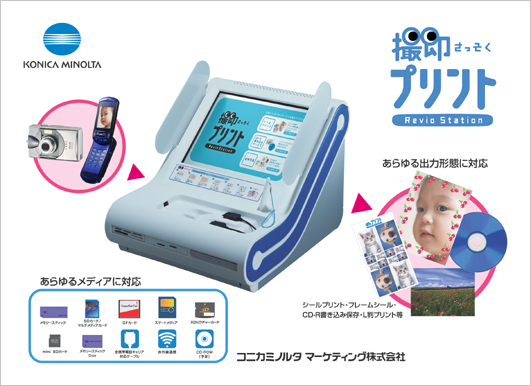 『撮即プリント Revio Station』は、カメラ付き携帯電話やデジタルカメラで撮影され様々なメディアに保存される画像を、店頭でシールタイプや通常のプリントに出力して楽しんでいただくことを意図して、入力部をオムロン株式会社(代表取締役社長 作田久男 以下オムロン)、出力部をコニカミノルタグループの事業会社であるコニカミノルタフォトイメージング株式会社(代表取締役社長 岩間秀彬 以下コニカミノルタフォトイメージング)が担当し、コニカミノルタマーケティングが両方を組み合わせてプリントシステムとして商品化したものです。