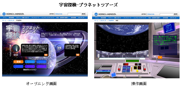 「宇宙探検-プラネットツアーズ-」は、コニカミノルタホームページの「おたのしみコンテンツ」の一つとして開設します。コニカミノルタでは、これからもこのコーナーに随時、お客様にとって役に立つ情報・お楽しみいただける内容を追加してまいります。