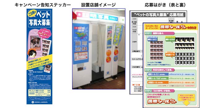 自動型証明写真ボックスなどの証明写真事業を行っているコニカミノルタアイデーイメージング株式会社(東京都新宿区 社長 中川 繁、以下コニカミノルタ)では、ご自分のペットをカメラ付き携帯電話※で撮影しコニカミノルタの証明写真ボックスで出力したシールプリントでご応募いただく『ご自慢のペットの写真大募集』キャンペーンを2005年1月17日まで実施いたします。