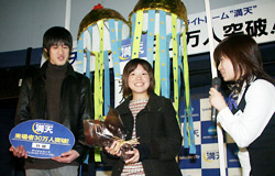 30万人目の来場者となられたのは、さいたま市にお住まいの杉山貴子さん(24)。友人の八王子市にお住まいの高柳航さん(25)とともに、初めてのご来場とのことで、ドーム内のステージで、 “満天”スタッフより記念品として、デジタルカメラ「コニカミノルタ ディマージュ X50 ブラック」が贈られました。