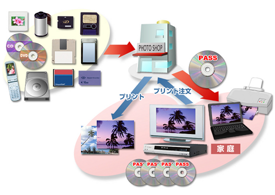 - お店でもご家庭でも、そのサービスを活用し、楽しむことが可能です。また、遠方のご家族・ご親族・お友達ともPASSディスクを利用して画像を共有できます。