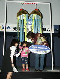50万人目の来場者となられたのは、埼玉県戸田市にお住まいの野村実生(みく)ちゃん(3歳)とお母様の淳子さん(31歳)。初めてのご来場で、「以前から来てみたいと思っていたのですが、今日は(実生ちゃんが)“お星様が見たい”と言ったので来ました」とのこと。実生ちゃんは、「びっくりした」と言いながら、ドーム内のステージで、記念品としてデジタルカメラ「コニカミノルタ ディマージュ X1 ワインレッド」を笑顔で受け取っていました。