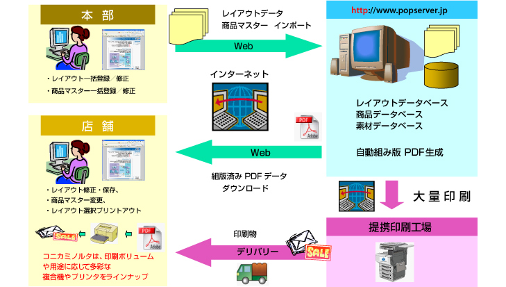 コニカミノルタビジネステクノロジーズ株式会社(社長:太田 義勝、以下コニカミノルタ)は、2005年12月8日より、流通業およびプロダクションプリント(軽印刷)市場向けに開発したインターネットドキュメント作成・配信システム「POPSERVER(ポップサーバ)」を活用したASP(アプリケーションサービスプロバイダ)サービスの国内市場に参入致します。
