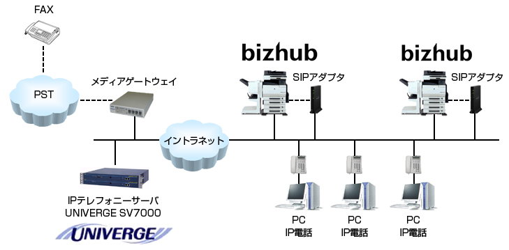 このたびの共同開発で、NEC製SIP対応テレフォニーサーバ「UNIVERGE SV7000」と、SIPプロトコルをサポートするNEC製SIPアダプタ「SFA-N010UJ」、コニカミノルタおよびNEC製の「SIP対応FAX機能搭載の複合機」を接続することにより、FAX通信もIPテレフォニー環境に集約することが可能となりました。また、特に、これまで普及が遅れていた複合機の「カラーファクス」機能を、高速、高画質、経済的に提供いたします。