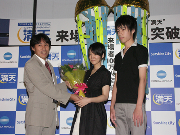 記念すべき100万人目にご来場されたのは、練馬区にお住まいの渡部希美(わたなべのぞみ)さん(19歳)とご友人の星野龍一(ほしのりゅういち)さん(19歳)。渡部さんは「星は好きで雑誌などではよく見るのですが、実際に見る機会はあまりなく、"満天"には前から行ってみたいと思っていました。初めて来たのに100万人目になるとは驚きです」とのことでした。記念品として、ユニクロの企業コラボTシャツ:コニカミノルタプラネタリウムバージョンと、東京ドームシティ アトラクションズのアトラクションチケットを贈呈致しました。