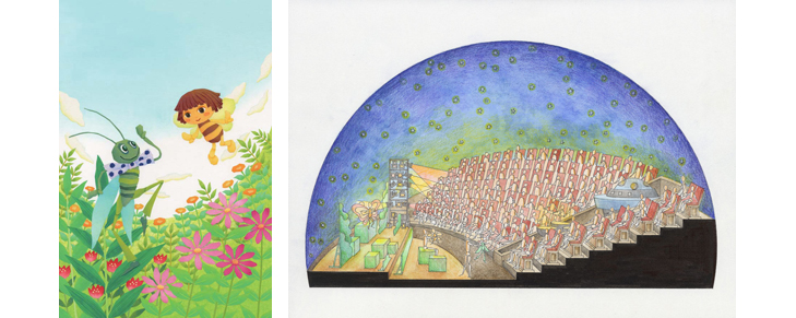 本公演では、プラネタリウム技術を活用し、舞台空間全体を覆うスクリーンに、星空はもちろん、青い空に浮かぶ雲、目の前に広がる草原やお花畑といった数々の自然の風景を投映いたします。