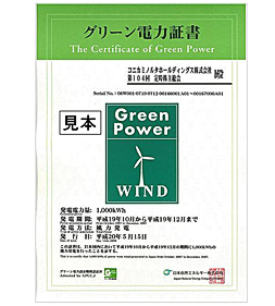 このたびのグリーン電力証書の購入では、日本自然エネルギー株式会社と契約し、「グリーン電力証書システム」(1000kWh)の発行を受けました。本契約では、株主総会会場で使用する照明、空調、運営機材などに係わる電力を北海道稚内市の風力発電でまかなうよう委託しました。