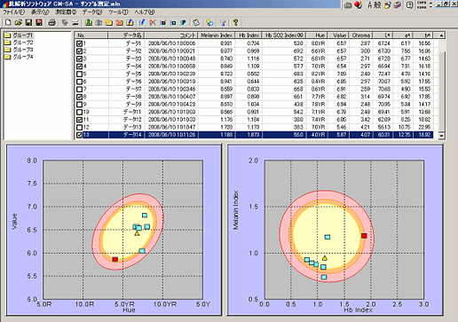 | グラフ表示 | Hue - Valueグラフ、Hb Index - Melanin Indexグラフ |