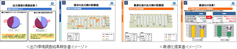 『出力環境最適化コンサルティングサービス』は、お客様の事業所内に点在するMFPやプリンタなどの出力機器の利用状況を可視化した出力環境調査結果報告と、調査結果にもとづいた最適な出力機器の統廃合と再配置のコンサルティングを提供するサービスです。