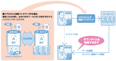 お客様の施設に設置された、CRコンソール/ビューワ/ファイリング機能を一体化したオールイン端末「REGIUS Unitea(ユニティア)」(以下 Unitea)に保管されるデータを、コニカミノルタが用意するセンターストレージサーバーにリアルタイムで自動バックアップし、万一の故障発生においても代替機で参照データを閲覧可能です。