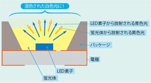 白色LEDの多くは、黄色の蛍光材料を塗布した青色LEDで、蛍光体材料が放射する黄色光と、内部の青色LEDが放射する光を混色して白色光となります。しかし、青色LEDの発光スペクトルは、波長分布が個体ごとに若干異なるため、できあがった白色LEDの白色光にもバラツキが生じます。
