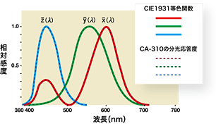 人間の目の感じ方をお手本に、それに限りなく近いセンサーを開発しました。右図グラフ上の3本の実線はヒトの目の感じ方を示していますが、点線で示した新センサーのカーブは、これにぴったりと一致しています。