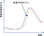 分光測色計では日常的な作業の中で白色校正を行い、そこでは分光反射率係数(右図縦軸)の校正を実施します。本製品は、この白色校正時に波長方向(右図横軸)の校正も自動的に行う、業界初の「波長自動校正機能」を搭載しました。