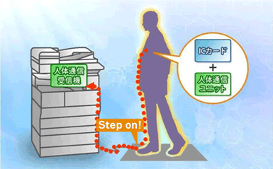 今回、両社で新たに開発した「人体通信によるカード認証MFPシステム」はICカードを装着した送信機(人体通信ユニット)を身に付けて使用します。受信アンテナの役割を果たすマットの上に立つだけ、あるいは筐体に設置されたタッチパネルに触れるだけで、使用者の認証が行えます。利便性が向上するだけでなく、あらゆる人が使いやすいユニバーサルデザインに配慮した製品となっています。IC カードは大日本印刷が事務局となっているSSFC*4カードにも対応しているため、同仕様に対応しているSSFC機器のみならず、文書暗号化などのアプリケーションと連携することで、オフィスのセキュリティレベルの向上が図れるとともに、より簡単かつ便利にセキュリティの運用を行うことができます。既存のシステムとICカードに大幅な変更を加えることなく、人体通信ユニットを追加することでこのような利便性が得られますので、経済的にも優れています。