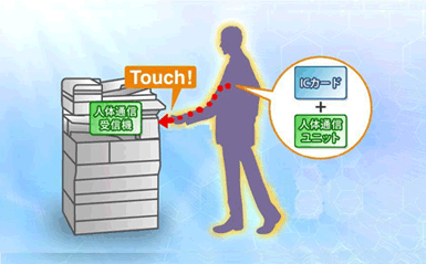 最近では、セキュリティ強化のため企業内の入退出や、オフィスでのパソコン、複写機の使用などで、ICカードをかざして使用するケースが増えてきました。しかし、カードをかざす際にバックやポケットの中からカードを取り出す手間や、パソコンの認証で接触型のリーダーに装着したICカードを、プリントやコピーの度に抜き取らなければならないなど、デメリットもあります。コニカミノルタと大日本印刷は、こうした課題を解決するため人体通信技術を使用して、自身の体が「モノ」に触れるだけでMFP利用時の認証が行えるシステムを開発しました。