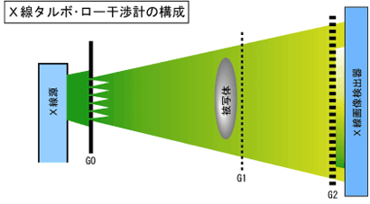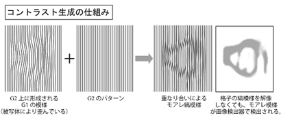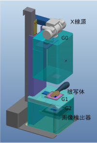 本装置の最大の特徴は、3枚のすだれ状X線格子(G0、G1、G2)を用いることによって、被写体によるX線の屈折をモアレ縞として可視化することです。