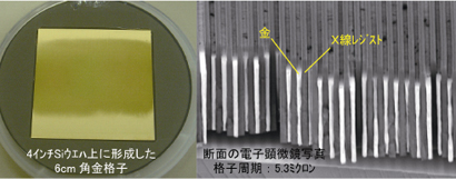 これらのX線格子は、ニュースバル放射光施設ビームライン2を用いたX線リソグラフィ注7)と金メッキ技術を用いて製作しました。最も製作が難しいX線格子(G2)は、5.3μmの周期、30μmの高さ、6cm角の面積を持っています。