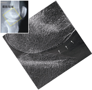埼玉医科大学に設置した装置で撮影した画像です。矢印で示すように、骨の輪郭に沿ってもう1本の輪郭が描出されています。これは、その形態や厚みから関節軟骨の輪郭に合致すると考えられます。従来のX線写真(左上)では描出が困難であった構造です。