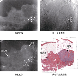 名古屋医療センターに設置した装置で撮影した画像です。左上に示す吸収画像(従来のレントゲン画像に相当)では、腫瘤部は乳腺より若干低吸収で、腫瘤外には管内がんにより形成された石灰化が白く認められ、本腫瘍が腫瘤を形成した浸潤部分のほか周囲に管内がんを伴っていることが示されています。右上に示されている微分位相画像では、コントラストが乏しく、撮影した組織の構造を解読することが困難です。一方、左下に示されている散乱画像では、吸収画像で観察できなかった石灰化成分に由来すると考えられる信号が明らかに増加しています。これは右下に示した病理組織で得られた診断結果とよく対応しています。