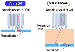 本製品では、右図のように保護膜(Protective layer)を介さずにヨウ化セシウム(CsI)シンチレータ(蛍光体)※4をTFTセンサーパネル※6上に直接接触させる「直接貼りあわせ技術」を採用したため、シンチレータで発した光をTFTとの接触面で拡散させることなくフォトダイオードまで導くことが可能となり、より精細な画像を形成します。