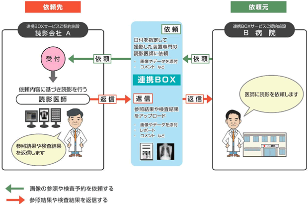 読影サービス事業者などに「連携BOX」を使って読影を依頼するサービスです。