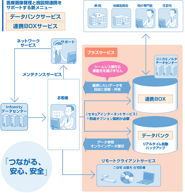 医療現場におけるデジタル化の進展とともに、ネットワークを活用した医療ITサービスへの期待が高まっています。コニカミノルタは、こうしたニーズを先取りし、診断機器の遠隔サポートや、病院間での情報共有サポート、医療行政ニュースの配信など、医療機関のネットワーク化を支援するトータルサービス「infomity」を提供し、ご好評を頂いています。