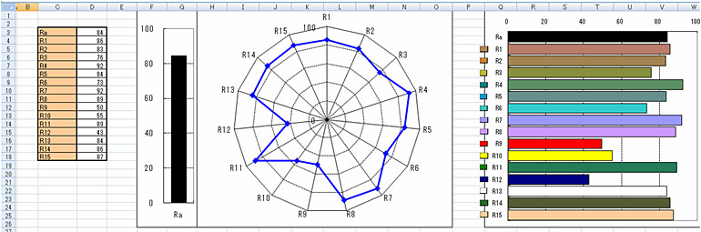 標準付属品のソフトウェアを使えば、測定データを直接エクセルに取り込むことができます。さらに、同じソフトウェアを使って、演色性に関する豊富な表示形態で演色評価数を視覚的にわかりやすく表示できます。例えば下図のようなグラフを表示させれば、試験色全15色に関する試料光源と基準光とのずれが一目でわかります。