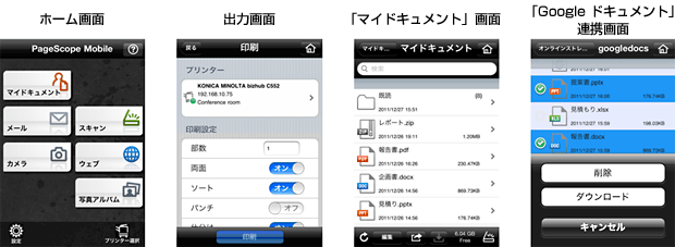 さらに、様々なビジネスシーンにおいて広く普及しているクラウドサービス「Google ドキュメント™」※1との連携機能を追加しております。これにより、Googleドキュメント上のファイルやデータをiPhoneやiPad上の『PageScope Mobile』にダウンロードしてbizhubから印刷することや、本アプリケーションに取り込んだスキャンデータをGoogleドキュメント上にアップロードして保存することを可能にし、よりお客様の業務効率化へ貢献する仕様となりました。
