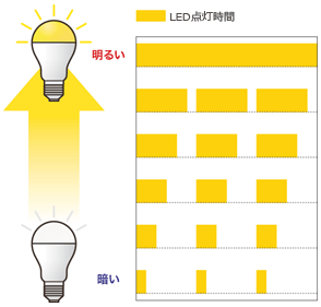 パルス幅変調(PWM:Pulse Width Modulation)とは、発光時間と消滅時間の比率を変更することにより発光強度を制御、調整する方法です。右図は、PWM調光の模式図です。上にいくほど発光している時間の割合が長く、光源の発光強度は明るくなります。