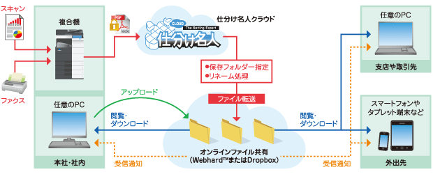 コニカミノルタの複合機(MFP)「bizhub」(ビズハブ)と連携※2し、電子化したスキャン文書や受信したFAXの"リネーム(ファイル名変換)処理"からオンラインストレージ上の指定フォルダーへの保存までを自動で行うサービスをご提供します。お客様は、既存のインターネット環境を活用でき、新たなサーバーや仕分け用のPC設置が不要であるため、導入費を抑えることができます。また、簡単な操作画面で初めての方でも容易に運用していただけます。