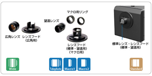 3種類の交換レンズと接写リングにより、標準、広角、望遠、マクロ1、マクロ2の5種類の画角に切り替えができます。液晶テレビや有機EL テレビなどの大型ディスプレイの測定から、カーナビや車のインパネ、小型の液晶パネルなどの微小なエリアの測定まで、測定対象物の大きさに合わせた測定が可能です。