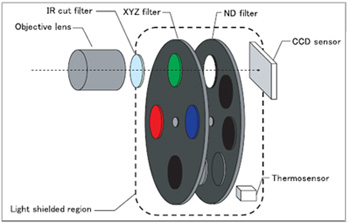 | 受光素子 | CCDイメージセンサ(モノクロ)、 有効画素数1,000×1,000画素(測定点数:980×980画素)、 XYZフィルタ内蔵(CIE1931等色関数に近似)、NDフィルタ内蔵 |
