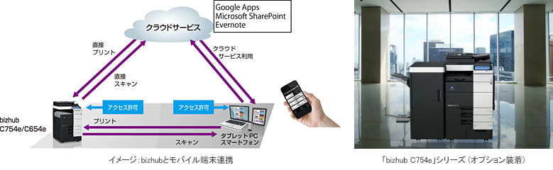 新機能として、クラウドサービス「Google Apps™」※1「Evernote®」※1と、「MicroSoft® Office SharePoint Server®」※1に連携しています。スキャンしたドキュメントを複合機から直接クラウドサービスに保存でき、クラウドサービス上に保存しているデータを複合機の操作パネルから直接印刷することが可能となりました。また、モバイル端末向けアプリ「PageScope Mobile」※2では、クラウドサービス上のドキュメントをPCを使用せず印刷できるため、文書管理の効率化と情報共有に貢献します。
