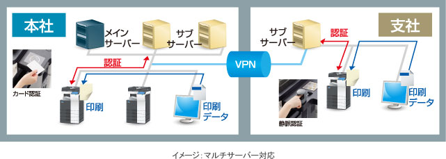 さらに、企業内に散在する複合機を一元管理する当社のアプリケーション「PageScope Enterprise Suite※3」を活用すれば、複合機全体の使用状況把握や認証情報の統合管理ができ、効率よくTCO(Total Cost of Ownership)の削減が図れます。複数(マルチ)サーバー構成にも対応し、認証情報や印刷ジョブの処理など役割を分けることで、一極集中を避け、ネットワークの負荷を軽減します。また万一、1台のサーバーがダウンした場合でも複数のサーバー内で役割を切り替えることで、ダウンタイムを短縮します。加えて、ICカード認証印刷で、複合機を自由に選択し出力できる“ユビキタスプリント”が可能で、プリントの取り忘れや部外者による持ち去りを防ぎ、セキュアな環境を提供します。