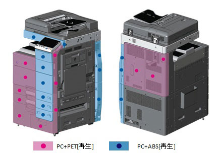 当社は、安全基準を満たす強度や難燃性を備えた再生樹脂「再生PC/PET」をケミカルプロセッシング技術により独自開発し、フラッグシップ機「bizhub C754」シリーズ※1に事務機業界で初めて採用し「bizhub C754e」シリーズ、「bizhub 754」シリーズにも使用しております。この2シリーズで、3年間で約1000人が消費するPETボトル再利用量※2が見込まれます。