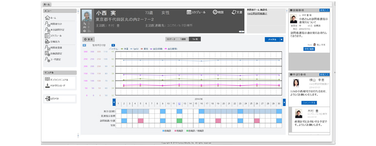 また、訪問看護師などが、在宅現場でiPad™用の在宅処置結果簡単入力アプリ「infomity 在宅メディケアノート」を使って体温、血圧、脈拍などのバイタルデータを入力したり、iPad™で撮影した写真をそのまま添付したりできるので、転記入力作業のムダを無くします。さらに、1人の患者についての情報が俯瞰できる「Dynamic Patient View」は、1つの画面で、患者の基本データのほか、バイタルデータの時系列グラフや多職種連携スケジュール、依頼事項と申し送り事項などをまとめて見ることができるので、患者の状態をチームで共有するのに役立ち、多職種間のコミュニケーションを円滑にし、素早い対応にも貢献できると考えます。