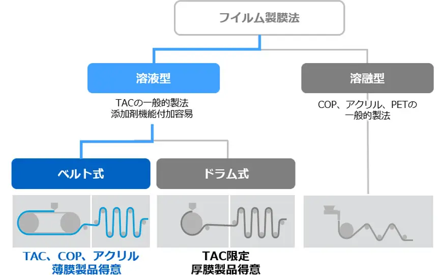 フィルムの製膜技術には「溶融製膜法」と「溶液製膜法」があります。溶融製膜法はポリマーを熱で融解し、溶液製膜法は溶媒を用いて溶解・流延後、乾燥・延伸工程を経てフィルムを製造します。溶液製膜法は「ドラム方式」と「ベルト方式」に分類され、当社では乾燥時間の制御が容易で薄膜製膜に優れた「ベルト方式」を採用。これにより、高品質なフィルム製品を安定的に供給し続けています。