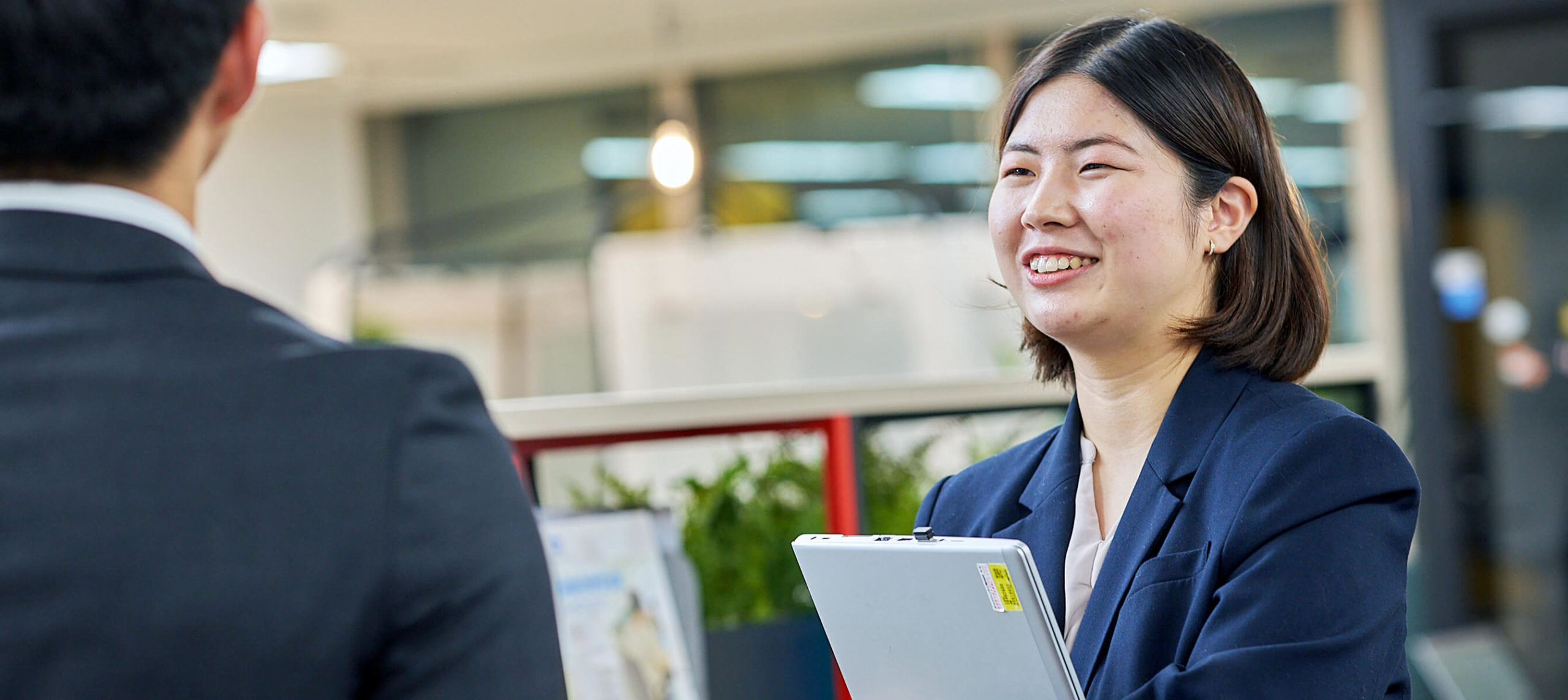 弊社に入社を決めた理由としては、就職活動中に実施した面接などで人事の方や先輩社員とお話ししている中で、職場の雰囲気が非常に明るいと感じることが出来たからです。入社後に何十年も働く会社になりますので、私は就職活動では職場の雰囲気を重視しており、それが自分のイメージと一致していた為、入社を決意しました。