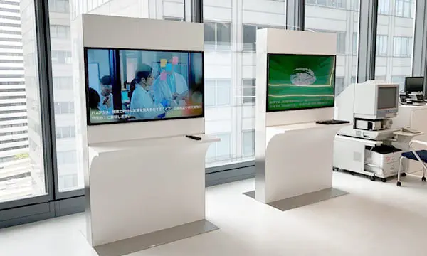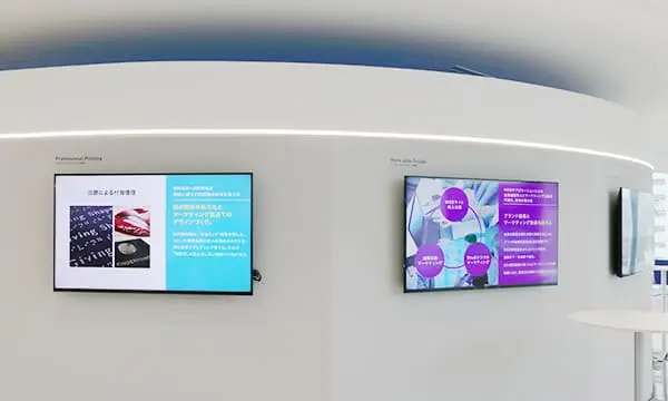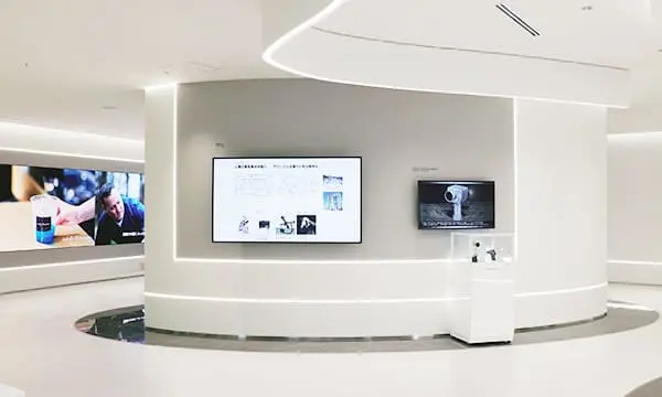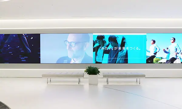 受付前の4連LEDサイネージ。コニカミノルタの各種最新ニュースやイベント、その他トピックスについてご紹介しています。