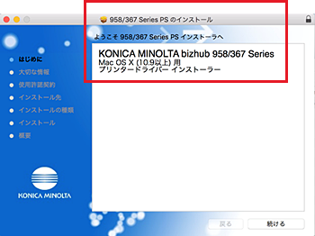 インストール画面に、bizhub 367 Seriesと表示されますが、bizhub 287 / 227用のプリンタードライバーがインストール可能です。