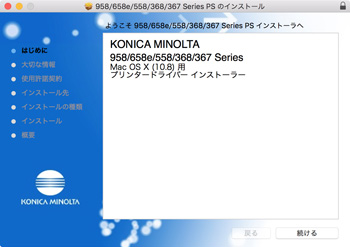 本ソフトウェアは、bizhub 658e / 558e / 458e / 368e / 308e / 758 / 558 / 458 / 368 / 308 / 287 / 227用 OS X v10.8対応版のインストールを行うためのインストラーファイルをご提供するものです。
