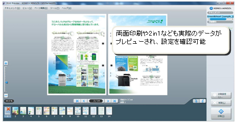 「プリントプレビュー機能」は、いままでにない緻密で正確なプレビュー機能を搭載することにより、PCの画面上に印刷の仕上がりイメージをまるで出力物のようなリアルさで表示を実現しました。また出力時の設定ミスもわかりやすく表示してくれるので、出力する前に手軽に直すことができます。