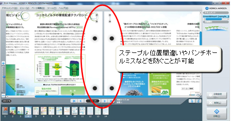 ステープル(1点留め、2点留め、中綴じ)やパンチ位置などを、設定すると実際にステープルやパンチ穴がプレビュー上に表示されます。